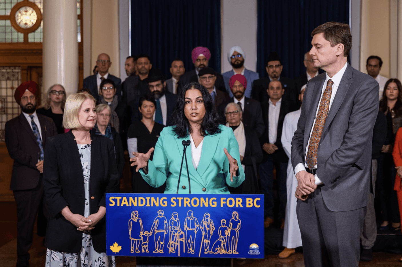 B.C. Attorney General Niki Sharma speaks at a news conference announcing proposed legislation to create protest buffer zones around schools and places of worship. Beside her are Education Minister Lisa Beare and Premier David Eby, with religious and community leaders behind them. (photo: The B.C. Catholic/B.C. Government)