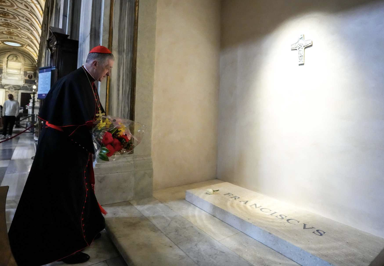 Cardinal Blase J. Cupich of Chicago bring flowers to the tomb of Pope Francis in the Basilica of St. Mary Major in Rome, March 2. (CNS photo/Lola Gomez)