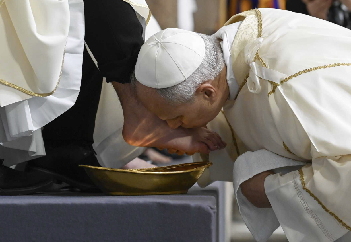 The pope’s words came during a Mass that commemorates Jesus’ institution of the Eucharist and the priesthood, and includes the traditional foot-washing ritual, which reflects the call to imitate Christ by serving one another.