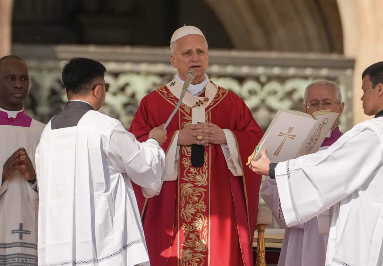 Dressed in red vestments, the colour of the Passion, Pope Leo followed, opening Mass underneath the obelisk. After the opening prayer and hymns, the procession made its way through the crowd to the altar in front of St. Peter’s Basilica.
