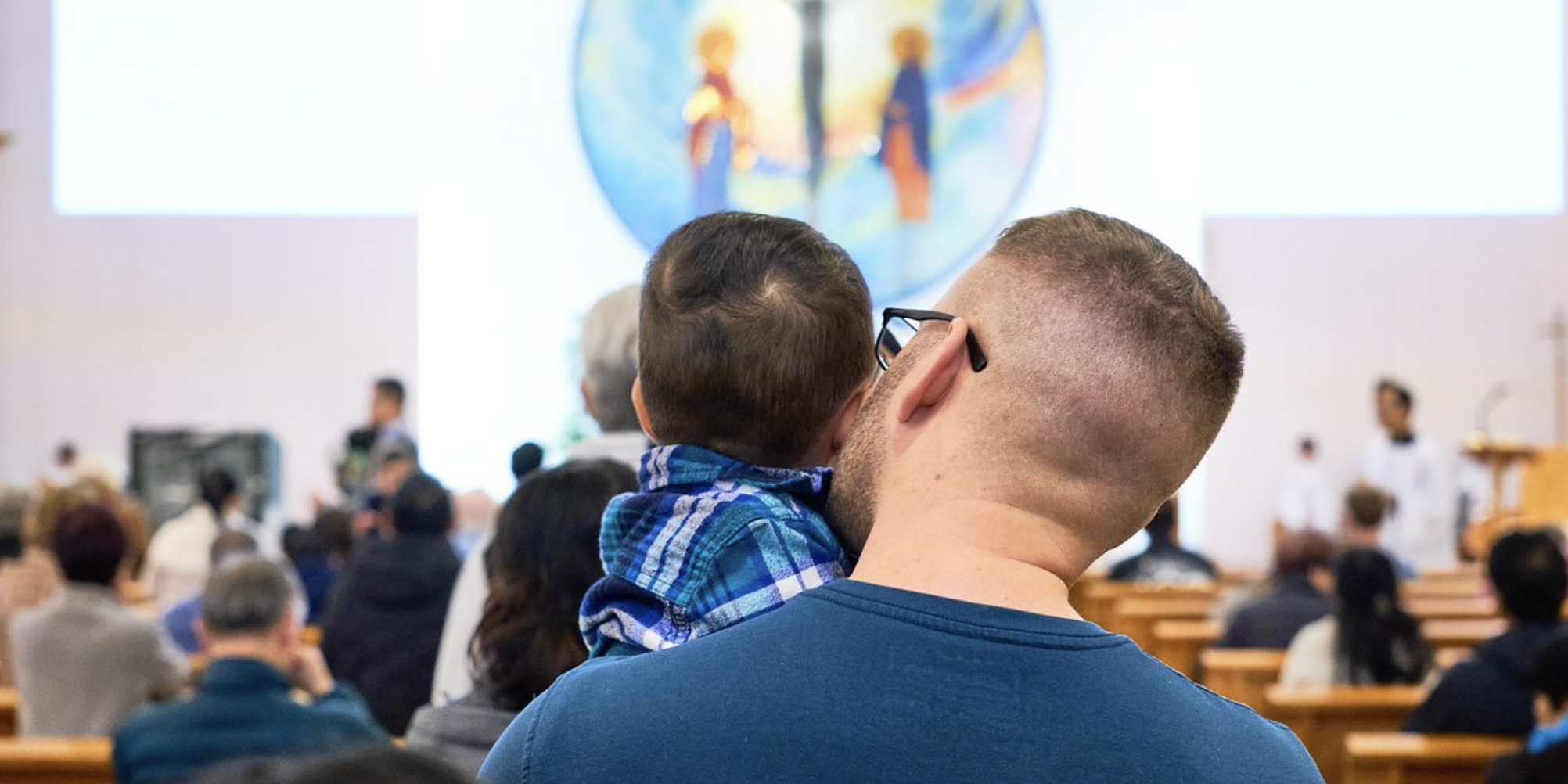 A father holds his son during Mass at Holy Name of Jesus Church in Vancouver before the Listening to God with Babies, Toddlers, and Children event on Oct. 26. (Photo: Nicholas Elbers)