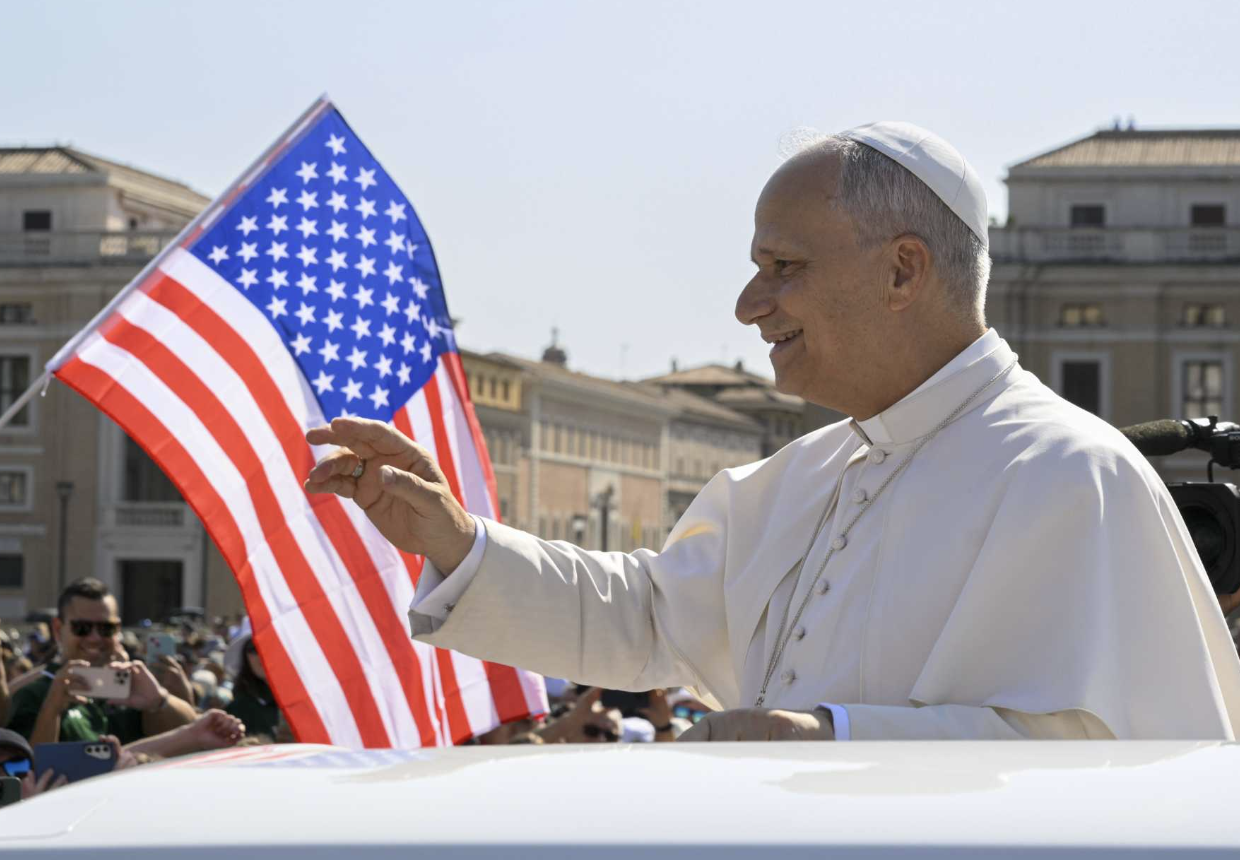 With a U.S. flag in the background, Pope Leo XIV waves to the crowd from the popemobile as he rides around St. Peter's Square at the Vatican before his weekly general audience Aug. 6, 2025. (CNS photo/Vatican Media)